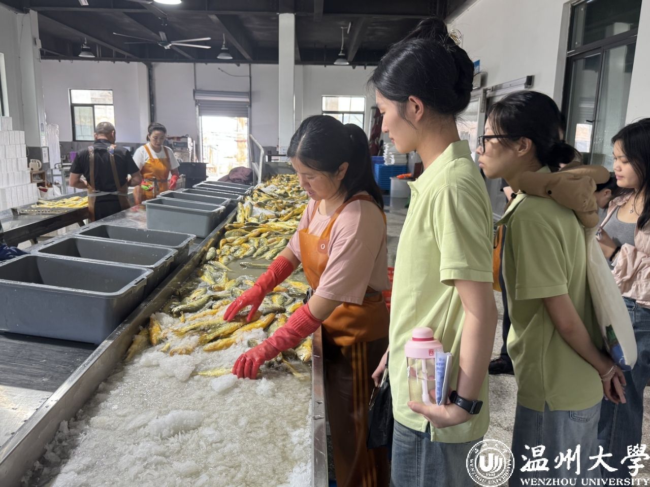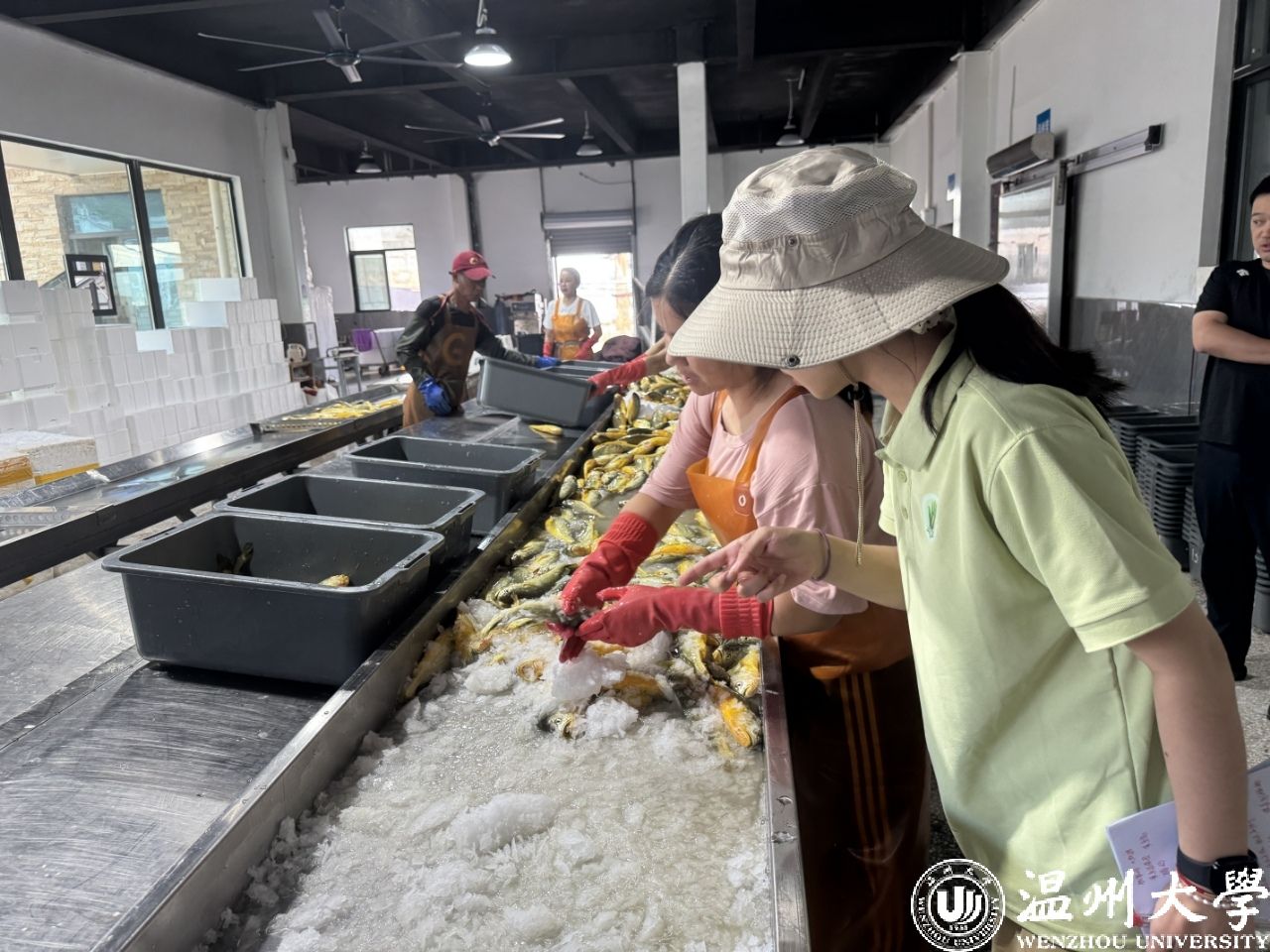 随后,实践队员们现场观摩了企业的大黄鱼打包流程。工作人员熟练地进行分拣、称重、打标签。队员们近距离观察了企业严格的操作规范和高效的冷链保障环节,对黄鱼岛品牌确保产品的新鲜度有了更直观的认识。