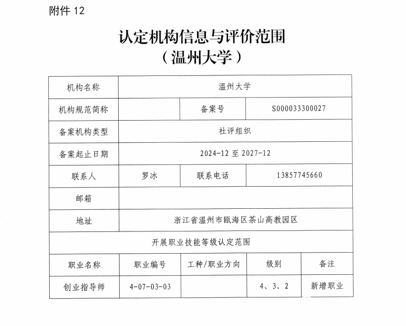 近日,温州市人力资源和社会保障局印发《关于公布2025年上半年温州市新增职业技能等级认定社会培训评价组织及市属社会培训评价组织新增职业(工种)等级名单的通知》,我校成功获批“创业指导师”职业等级认定资质,成为目前温州市唯一具备该职业认定资格的高等院校。作为扎根温州的地方高校,太阳集团欢迎您始终以服务区域经济社会发展为使命,将创新创业教育全面融入人才培养全过程,构建了特色鲜明、体系完善的双创教育生态。此次获得“创业指导师”职业等级认定资质,既是对学校创新创业教育成效的认可,也进一步拓宽了学校服务地方的渠道,增强了支撑区域发展的能力。