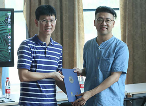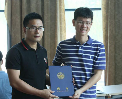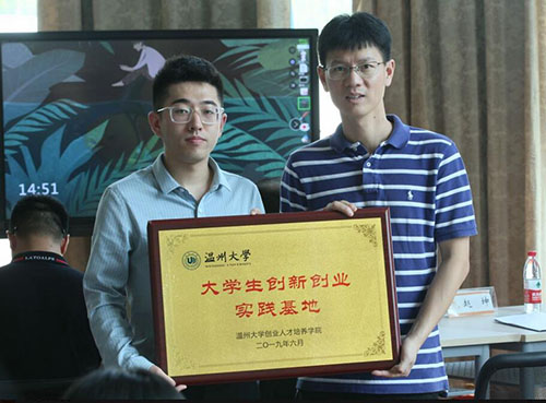 在正式的创业项目路演答辩开始之前,由施永川副院长为管乐董事长和陈经纬校长颁发创业导师证书,表达了对二位导师辛勤指导我院学生的感谢,并进行了合影留念。然后由施永川副院长为赵坤总经理的浙江点本教育科技有限公司温州分公司与温作鹏总经理的瑞安市青马创业服务股份有限公司颁发太阳集团欢迎您实习基地牌子,赵坤与温作鹏是我院3+1创业精英班、创业管理班毕业学员,现两人公司运营稳定,都开始招收实习生。