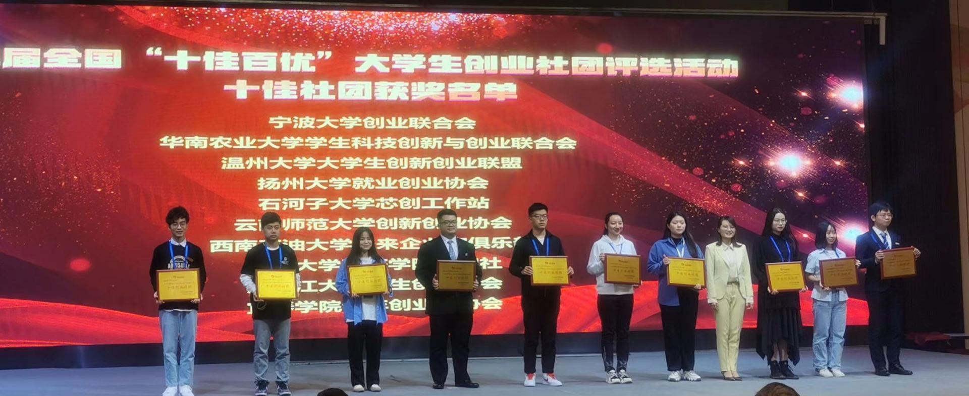 近日,第二届中国大学生创业社团发展高峰论坛暨2020年大学生创业社团服务联盟年会颁奖典礼在嘉兴落下帷幕,我校大学生创新创业联盟在第二届全国“十佳百优”大学生创业社团评选活动中,荣获“十佳创业社团”称号。