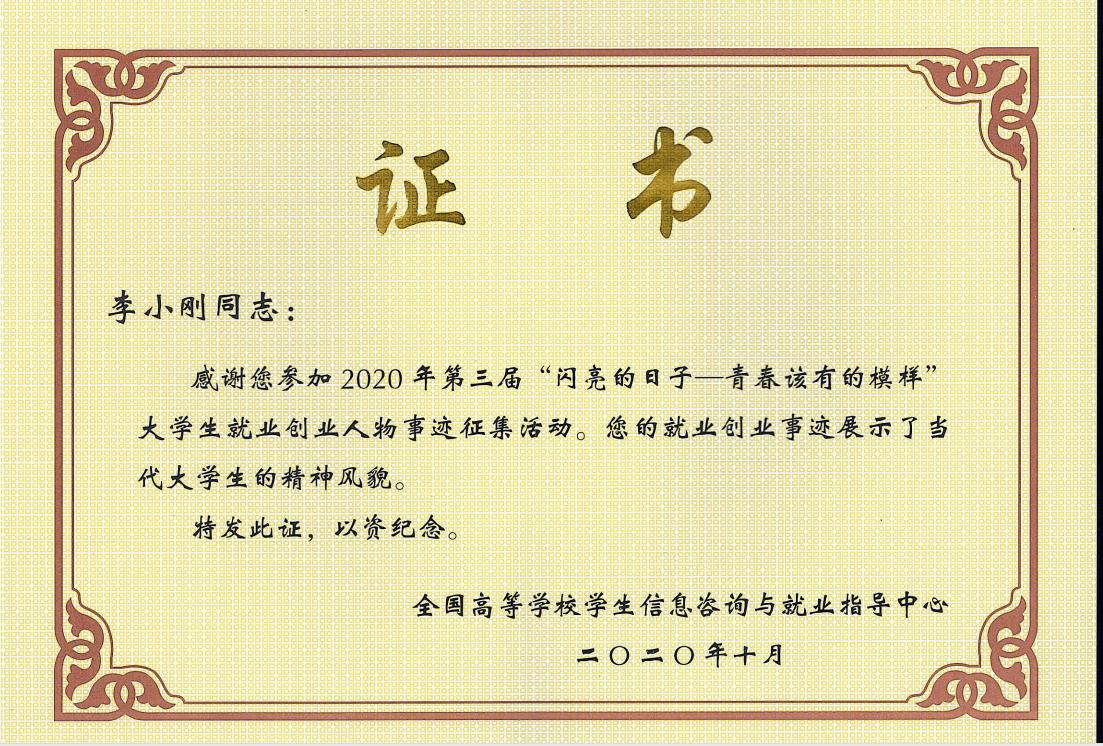 近日,教育部高等学校学生信息咨询与就业指导中心公布了2020年第三届“闪亮的日子——青春该有的模样”大学生就业创业人物事迹征集名单,我校机电工程学院2019届硕士毕业生李小刚成功入选创业人物,浙江省仅5人入选创业人物名单。