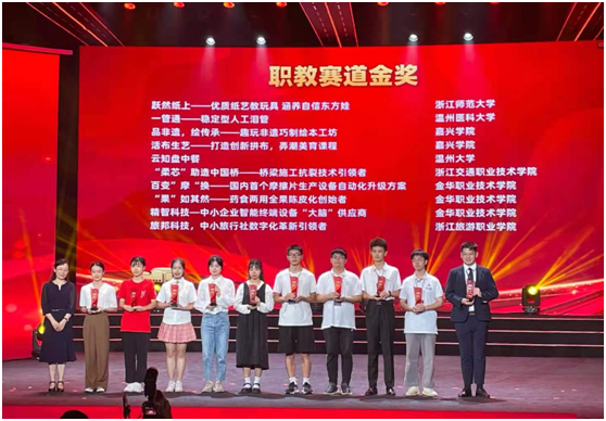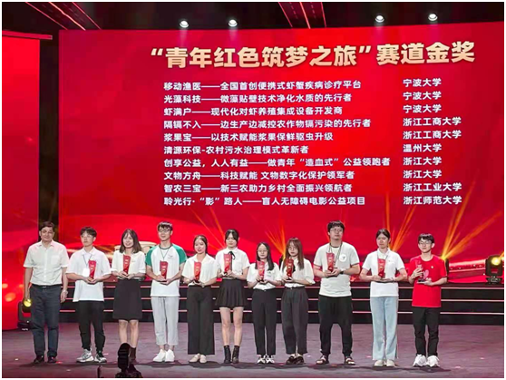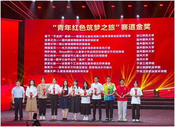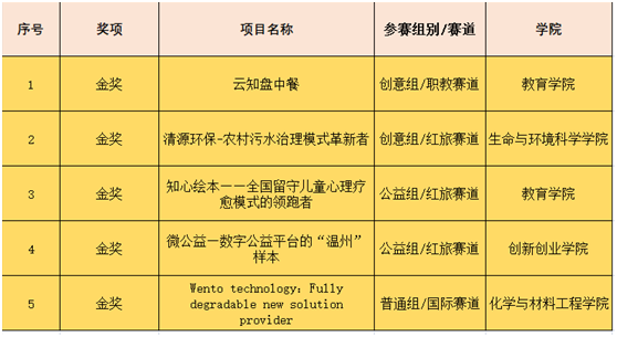 5项金奖中,《云知盘中餐》项目获得职教赛道金奖,《清源环保-农村污水治理模式革新者》、《知心绘本——全国留守儿童心理疗愈模式的领跑者》、《微公益—数字公益平台的“温州”样本》3个项目获得“青年红色筑梦之旅”赛道金奖,《Wento technology:Fully degradable new solution provider》项目获得国际赛道金奖。