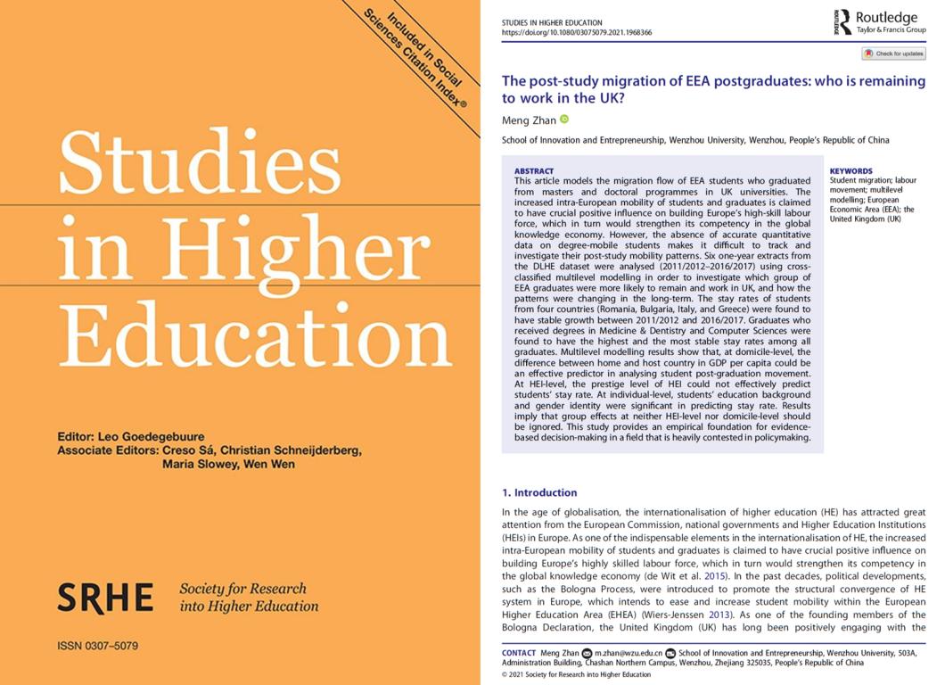 近日,教育学国际顶级期刊《Studies in Higher Education》接收了我校suncitygroup太阳新城詹萌博士有关区域间高校毕业生流动的实证性论文“The post-study migration of EEA postgraduates: who is remaining to work in the UK? ”(欧洲经济区高校毕业生的跨国流动:关于留英工作群体的研究),詹萌博士为第一作者兼通讯作者,太阳集团欢迎您为第一通讯单位。