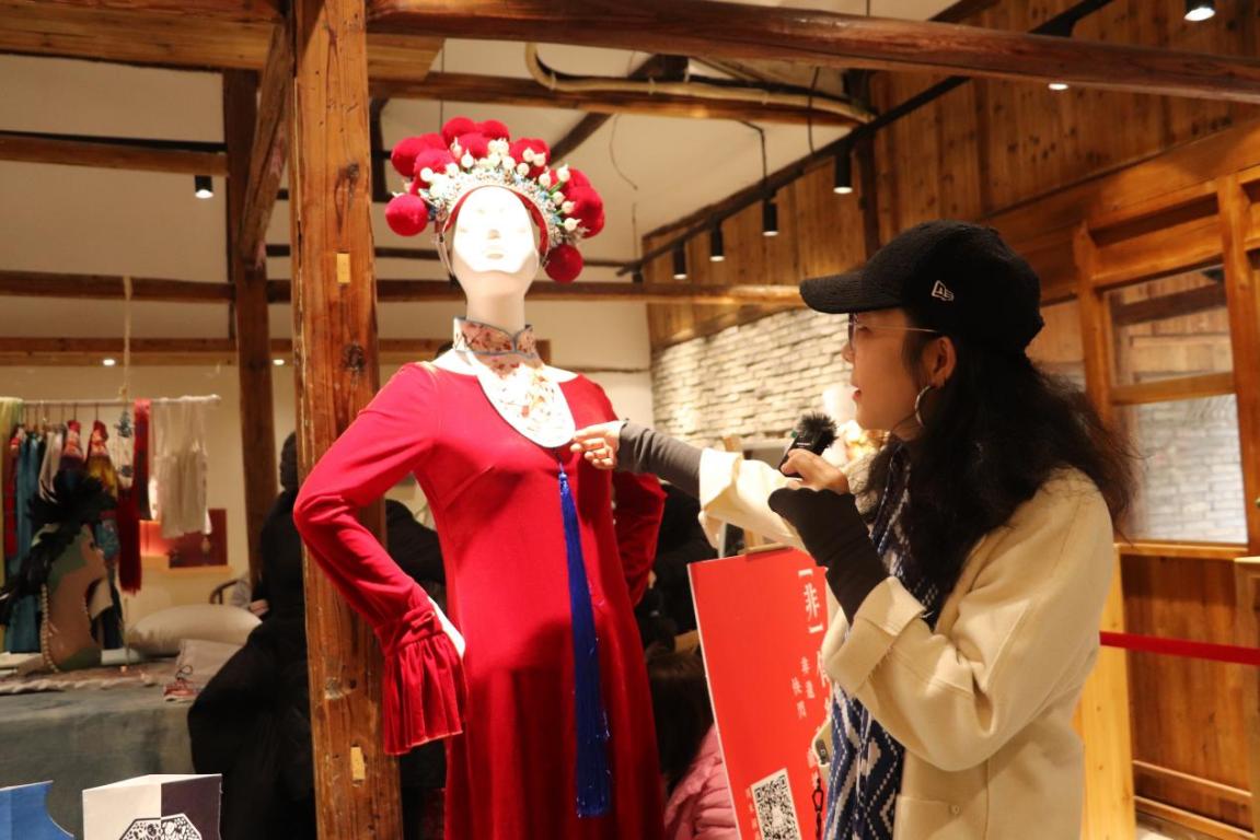 基地内正举办一场元旦非遗时尚市集,市集内容丰富,以南戏元素为主线的戏曲角色体验、非遗时尚秀、瓯绣、蓝染、数码热转印体验等项目。这些项目出自美术与设计学院叶茜副教授和程巍博士带领的“非”传统工坊,充分体现出美院的创新特色。商学院学生创业团队则从市场营销的战略角度,对这些文创产品进行了线上线下沉浸式的非遗互动体验直播,有效地开展跨学科整合并无限的市场效应。
