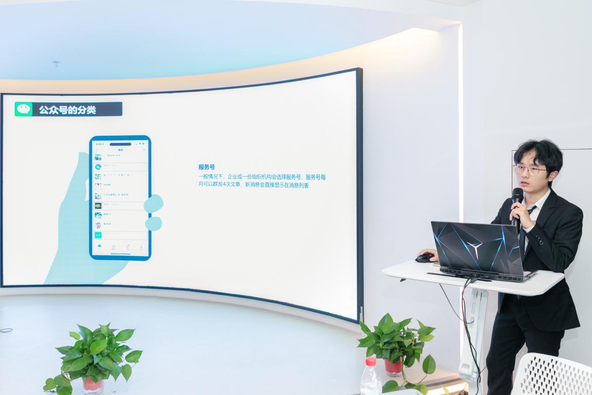 开班仪式结束后,培训讲师陈琅作《了解公众号》主题分享,从公众号的细节分类、创办目的、如何定位以及运营模式详细地为在场学员进行讲解。