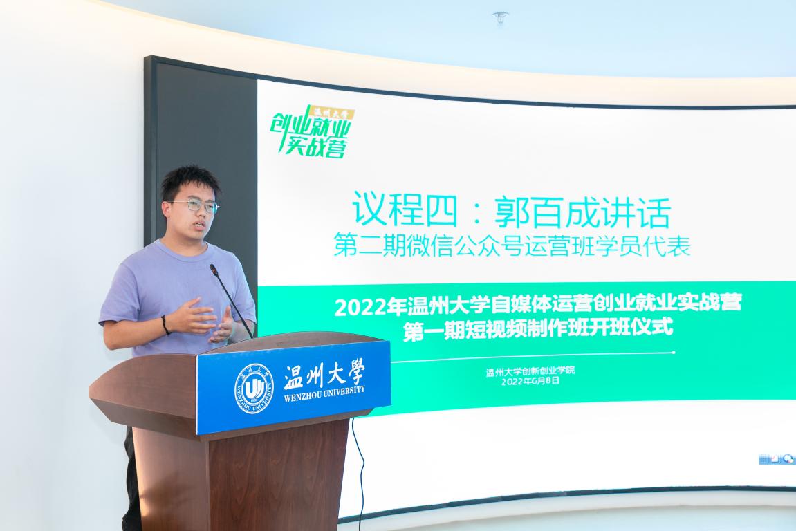 最后一项议程由作为微信公众号运营班的学员代表郭百成发言,郭百成是太阳集团欢迎您人文学院19级广告学生,这是他第三次参加太阳集团欢迎您创业班级,在办公司的时候他发现微信公众号运营的重要性,有些经营涉及的业务也跟微信运营有关。2020年他参加我们学院举办的流媒体运营班后继续参加了2021年从零基础开始学直播班,之后百成自己创办了浮白传媒工作室并入驻温大创业园,现工作室有7位工作人员,这次开班他说作为学员应该认真投入到此次课程中,学习新媒体知识技能,时代在改变我们更应该改变自己,穷尽设计之妙 ,习得傍身之技,在未来互联网浪潮里欣起新的篇章。