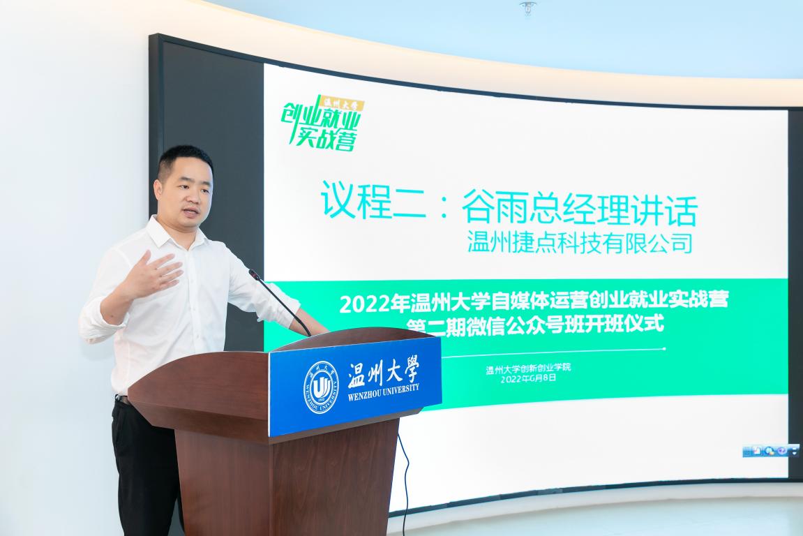 第二项议程由温州捷点科技信息技术有限公司谷雨总经理发表讲话。谷总希望大家可以珍惜本次自媒体运营班学习的机会,将掌握技能、学习知识建立在自己的兴趣之上,也预祝学员们在自己喜欢的领域大放光彩。