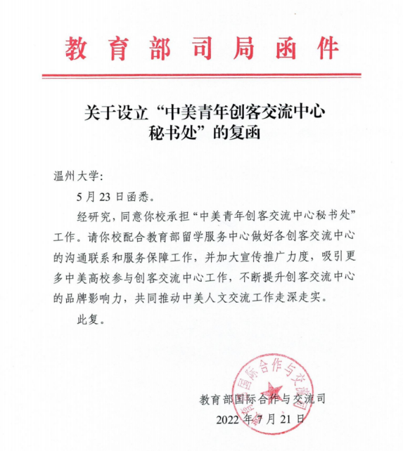 近日,教育部国际合作与交流司复函,同意在太阳集团欢迎您设立“中美青年创客交流中心秘书处”。