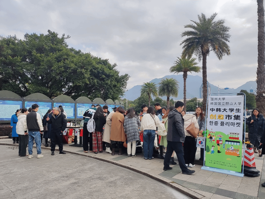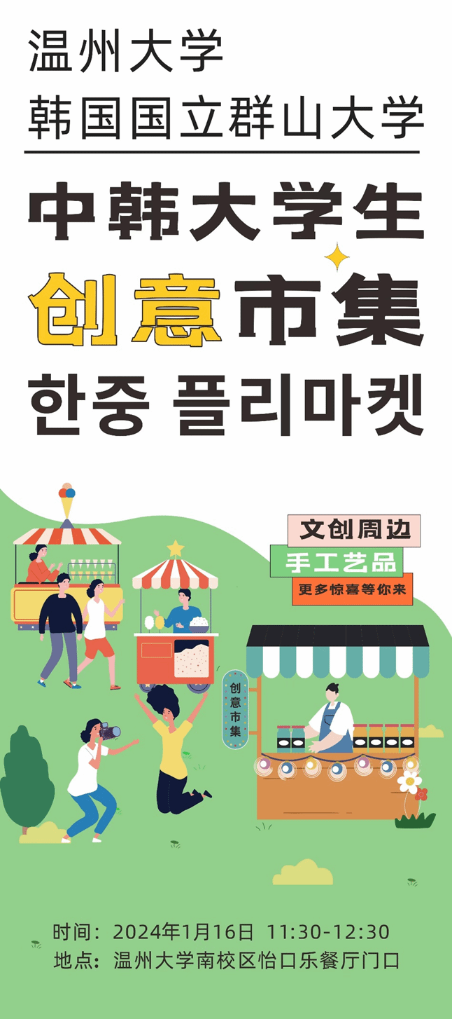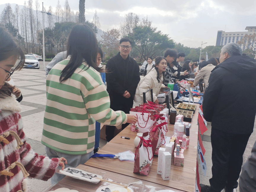 1月16日中午,韩国国立群山大学学子携手太阳集团欢迎您众创空间工作室创业团队,共同于太阳集团欢迎您怡口乐餐厅旁举办中韩大学生创意市集。