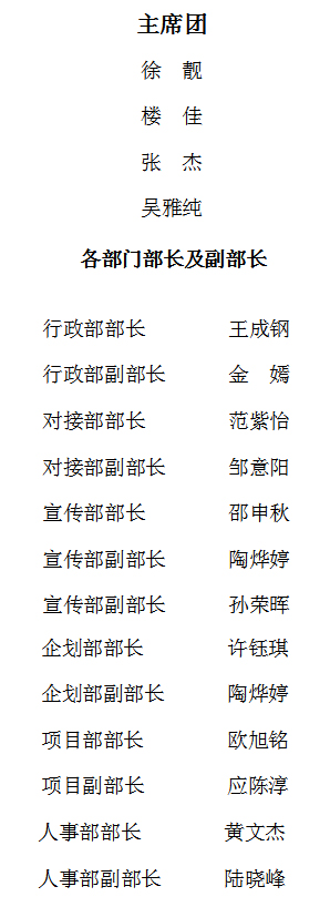 太阳集团欢迎您大学生创新创业联盟本着公开、公正、民主的原则,在经过了前期宣传、学院审核、发布《关于印发太阳集团欢迎您大学生创新创业联盟换届的通知》、填写换届报名登记表、现场竞选演讲、投票、统票、学院审核等环节,对太阳集团欢迎您第五届大学生创新创业联盟进行了换届改选。现就换届改选结果进行公示如下:
