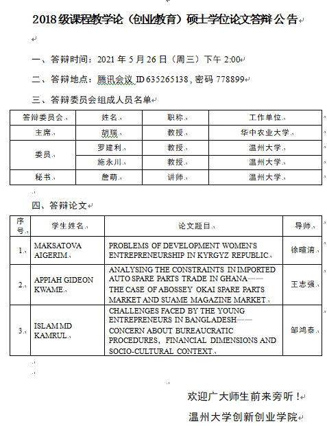 2018级课程教学论(创业教育)硕士学位论文答辩公告