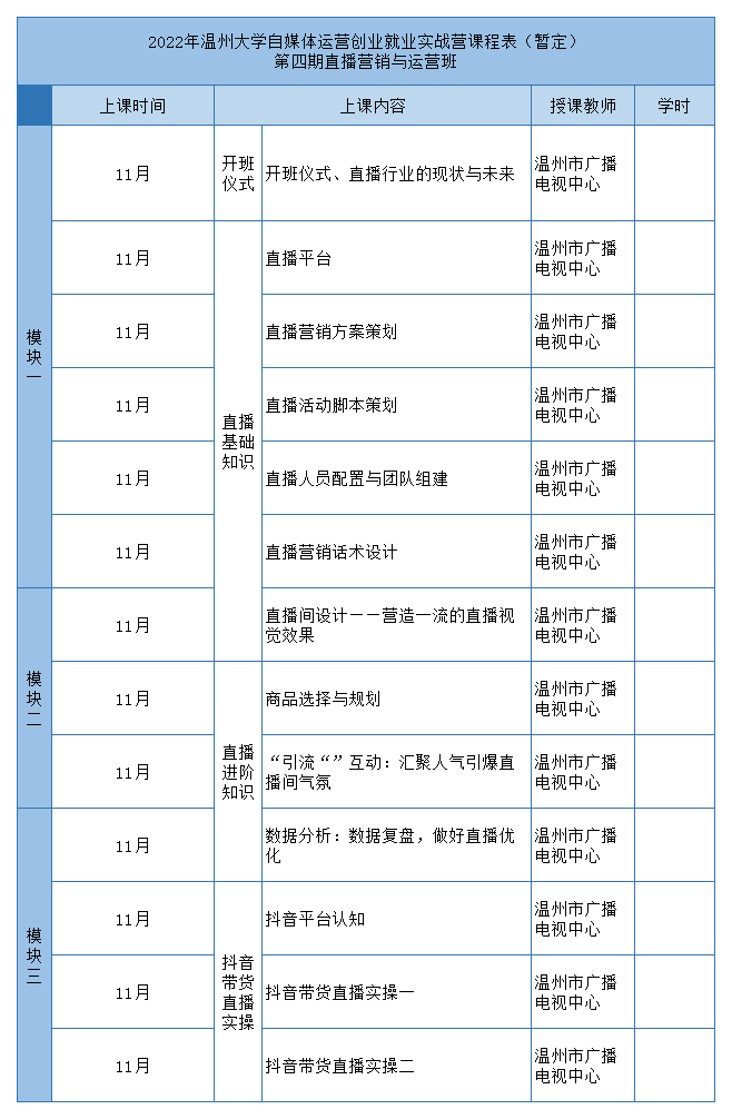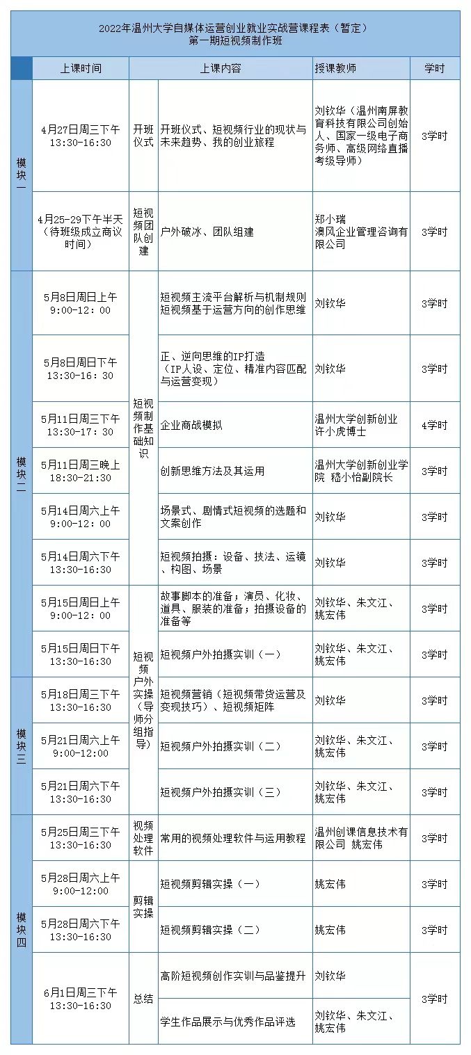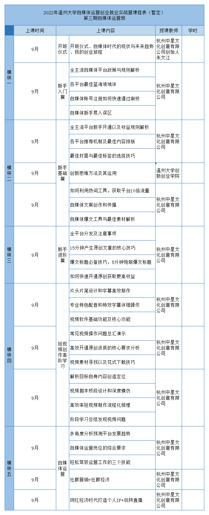 2.课程内容:自媒体平台基础操作、平台规则、视觉运营、实践考察等模块。